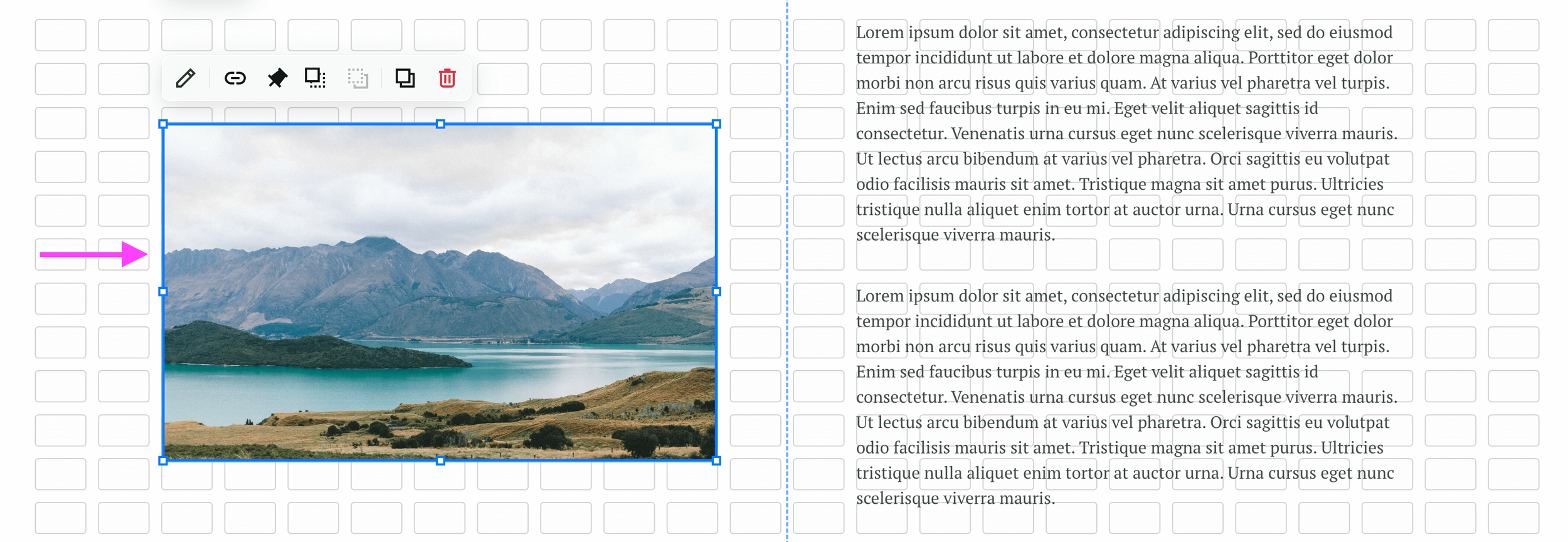 There might be times, when moving the block around, where the content appears separate from the blue frame. Don't let this trick you! The blue frame will always tell you where the block is actually aligned to the grid. If you aren’t totally sure where the block has landed, you can temporarily unpin the block to check its position.