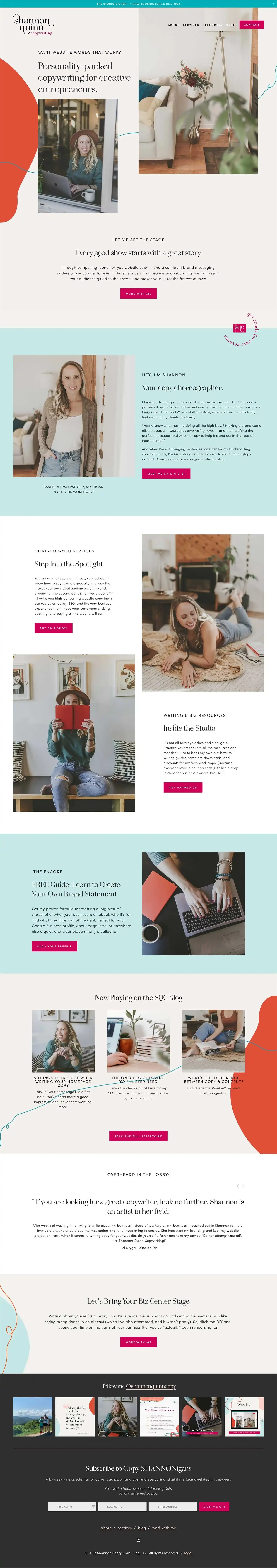 Shannon Quinn Nova Jan 14 Written By Erica Hartwick BUSINESS: Shannon QuinnINDUSTRY: CopywritingTEMPLATE: Nova Shop The Template Squarespace Template Gallery Shop the Nova Template Squarespace Template Gallery Style: ModernStyle: BrightStyle: CleanStyle: MinimalIndustry: Copywriters Erica Hartwick http://www.bigcatcreative.com